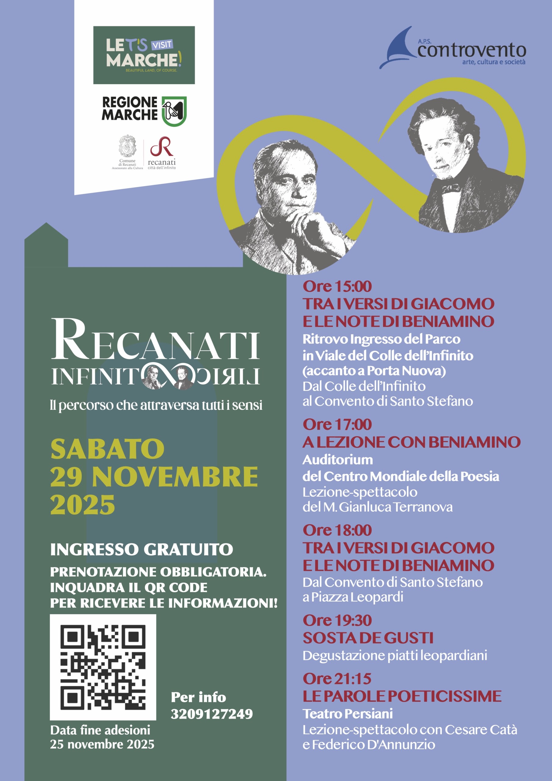 RECANATI INFINITO LIRICO TRA LE NOTE DI BENIAMINO E I VERSI DI GIACOMO un percorso che attraversa tutti i sensi Recanati, 29 novembre 2025 Recanati si prepara ad ospitare una giornata davvero speciale dedicata ai suoi due figli più illustri. Sabato 29 novembre prossimo, infatti, grazie al contributo della Regione Marche, e con il Patrocinio